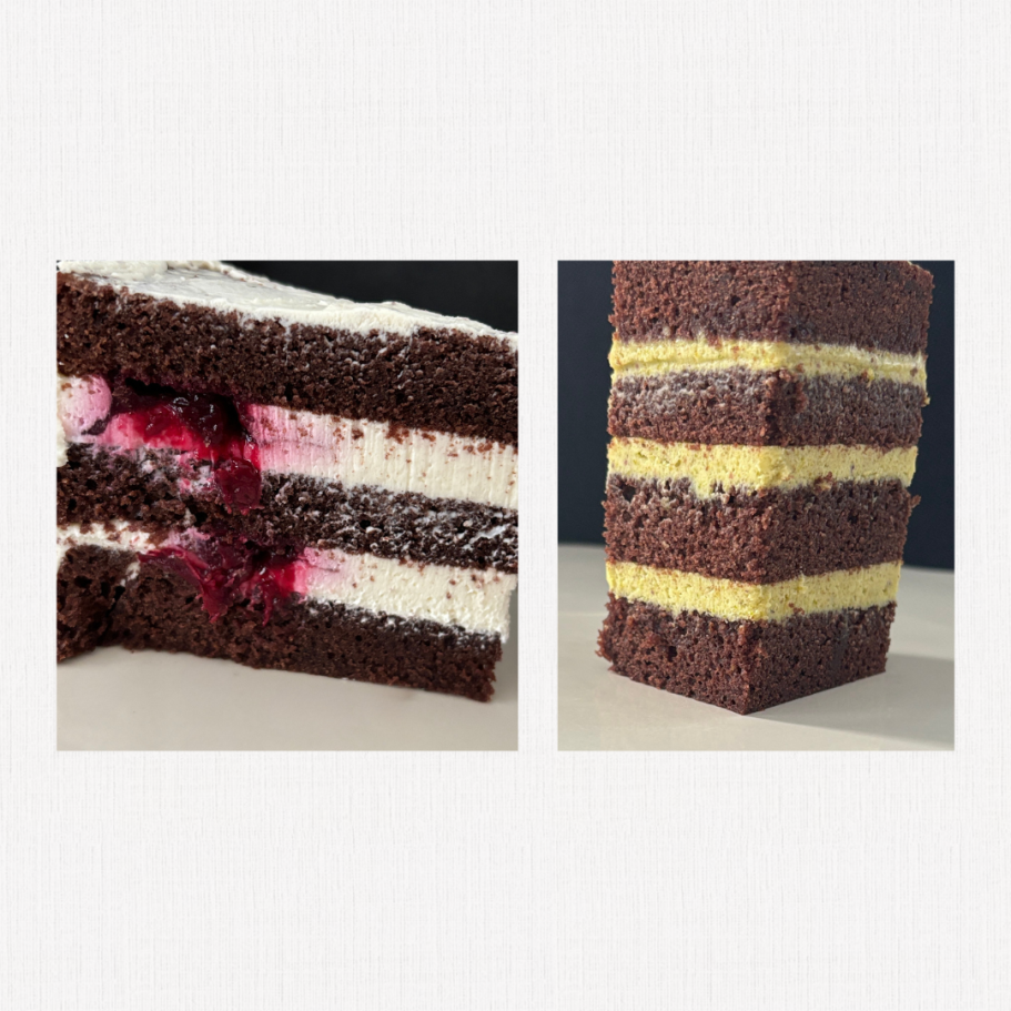 - Schoko-Biskuit, weiße Schokocreme und Himbeer-Konfitüre